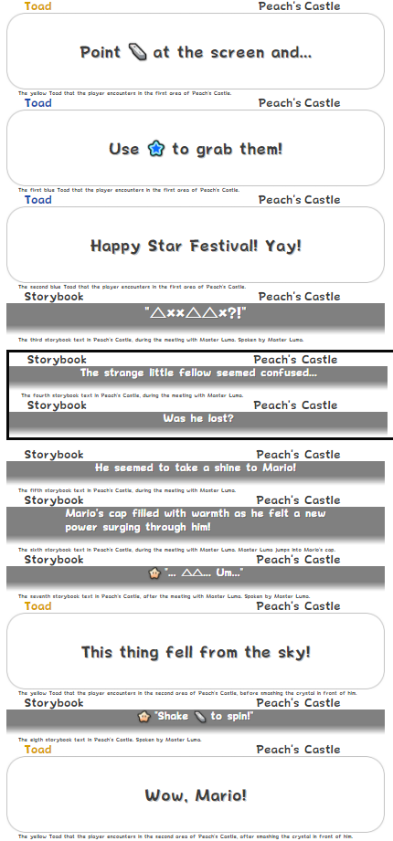 well, for the past... two+ weeks? i've been working on a site to display video game textboxes in your browser. i love text systems in video games, and i thought this would be a fun project. every textbox has a description under it to explain where in the game the textbox is found, continuous conversations are enclosed in a black border, and there are a few sorting options at the top of the page. everything is displayed in vw (so, sorry to people with ultrawide monitors) but i plan to add a zoom feature to fix that. i also plan to be able to link directly to specific textboxes/conversations, but for right now you just kinda have to scroll through the whole thing. i wanted to do it because of browsing the text files in Wii Fit/Plus/U, but then someone told me that no one would use the site if that was the only game on there. so i thought Super Paper Mario could be the first game i add to the site. but then i accidentally did Super Mario Galaxy 2 instead. oops. so, right now, it's just got some text from the USA English version of SMG2. not everything is perfect, but a lot of it is on the right track. there's a lot of text files i have to go through but i seem to be making good progress. SMG2 has a [character] tag that gets replaced with the name of either Mario or Luigi, depending on who the player is playing as right now, and there's a small dropdown box for that at the top of the page to emulate this. by default it's Mario, but by selecting Luigi, all the [character] tags will be replaced with "Luigi", instead. here's some screenshots of what it looks like so far: not everything is fully 100% perfect, of course. but i think this could be a really helpful resource for quoting various video games. i've been told the Zelda games would be especially useful, but i wanted to start with something i'm a bit more familiar with first. there's also a few... issues, with the site currently. (see spoilered image, for example.) but honestly... i don't know how to code. not in any language, including HTML. i got pretty far without any previous experience, though. only had to ask for help a couple times haha. so, if this project interests you, and you know how to fix the really annoying stuff that i can't find a solution for myself, feel free to fix it - everything is on GitHub. (not that the reason i made this post was so i could get people to code for me, of course. i'm sure with enough Google searching and hair pulling, i'll get them all eventually, heh.) anyways, enjoy
